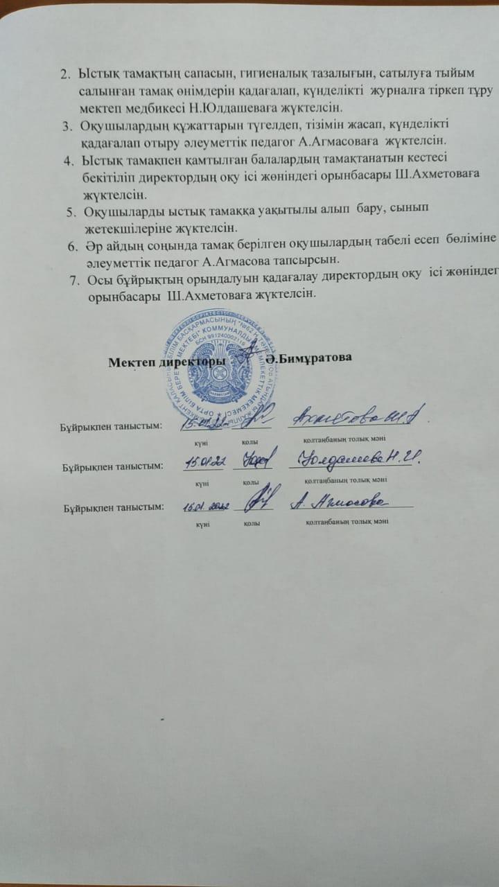 Қазақстан Республикасының Білім және ғылым министрінің 2020 жылғы 24 сәуірдегі №158 бұйрығының 10-қосымшасымен бекітілген «Жалпы білім беретін мектептердегі білім алушылар мен тәрбиеленушілердің жекелеген санаттарына тегін және жеңілдетілген тамақтандыруды ұсыну» мемлекеттік қызметті көрсету стандартын орындау және Шымкент қаласы әкімдігінің 02.12.2021жылғы №1524 қаулысы негізінде бастауыш 1-4 сынып оқушыларын түгел тамақтандыру негізінде Шымкент қаласының білім басқармасының хатына сәйкес, мектебіміздегі «Қамқоршылық» кеңесінің №5 хаттамасының шешімі бойынша «Жалпыға міндетті білім қорынан» әр балаға 484,1 теңгеден бөлінген қаржыға ыстық тамақ ұйымдастырылды.