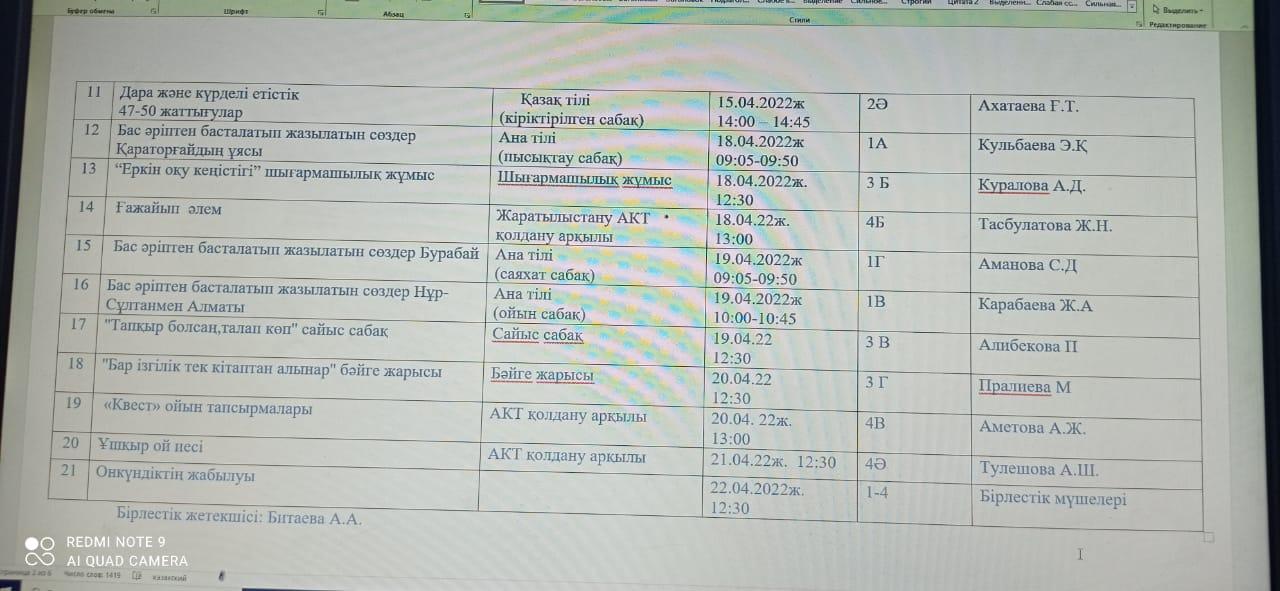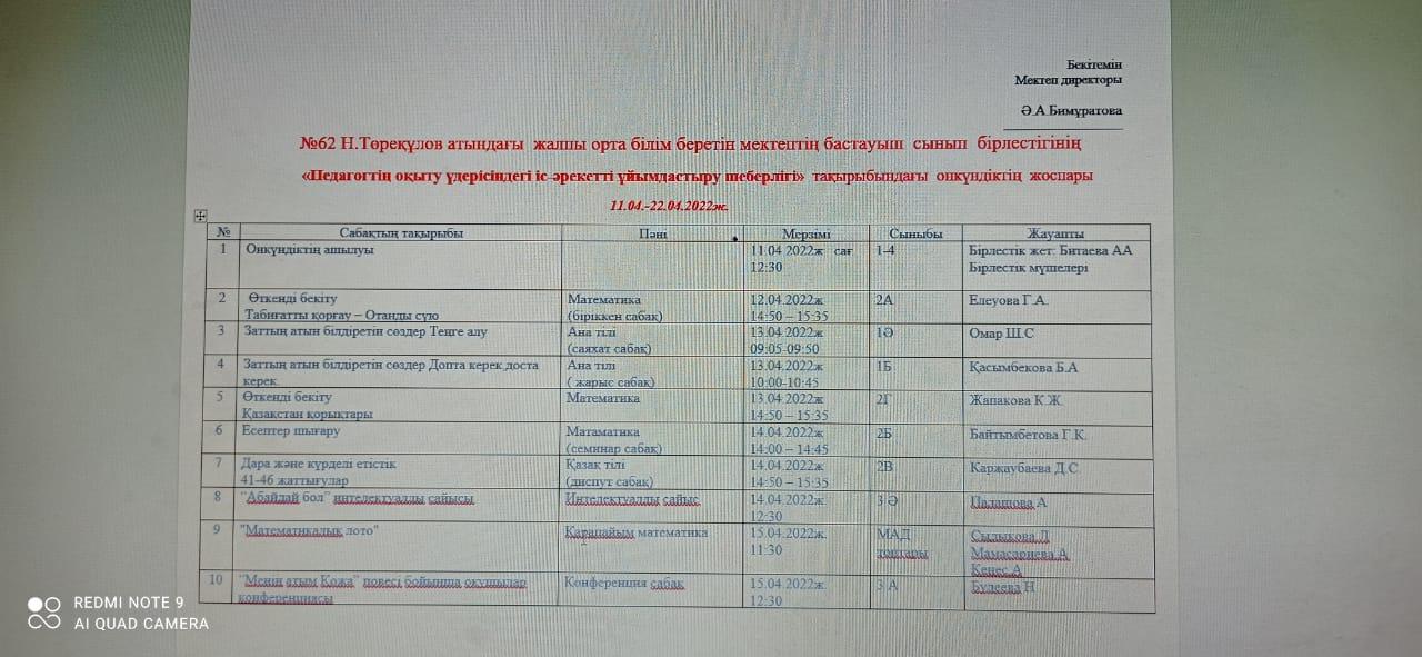 11 апрель 2022 0 1 2 3 4 5 №62 Н.Төреқұлов атындағы жалпы орта білім беретін мектептің бастауыш сынып бірлестігінің «Педагогтің оқыту үдерісіндегі іс-әрекетті ұйымдастыру шеберлігі» тақырыбындағы онкүндіктің жоспары